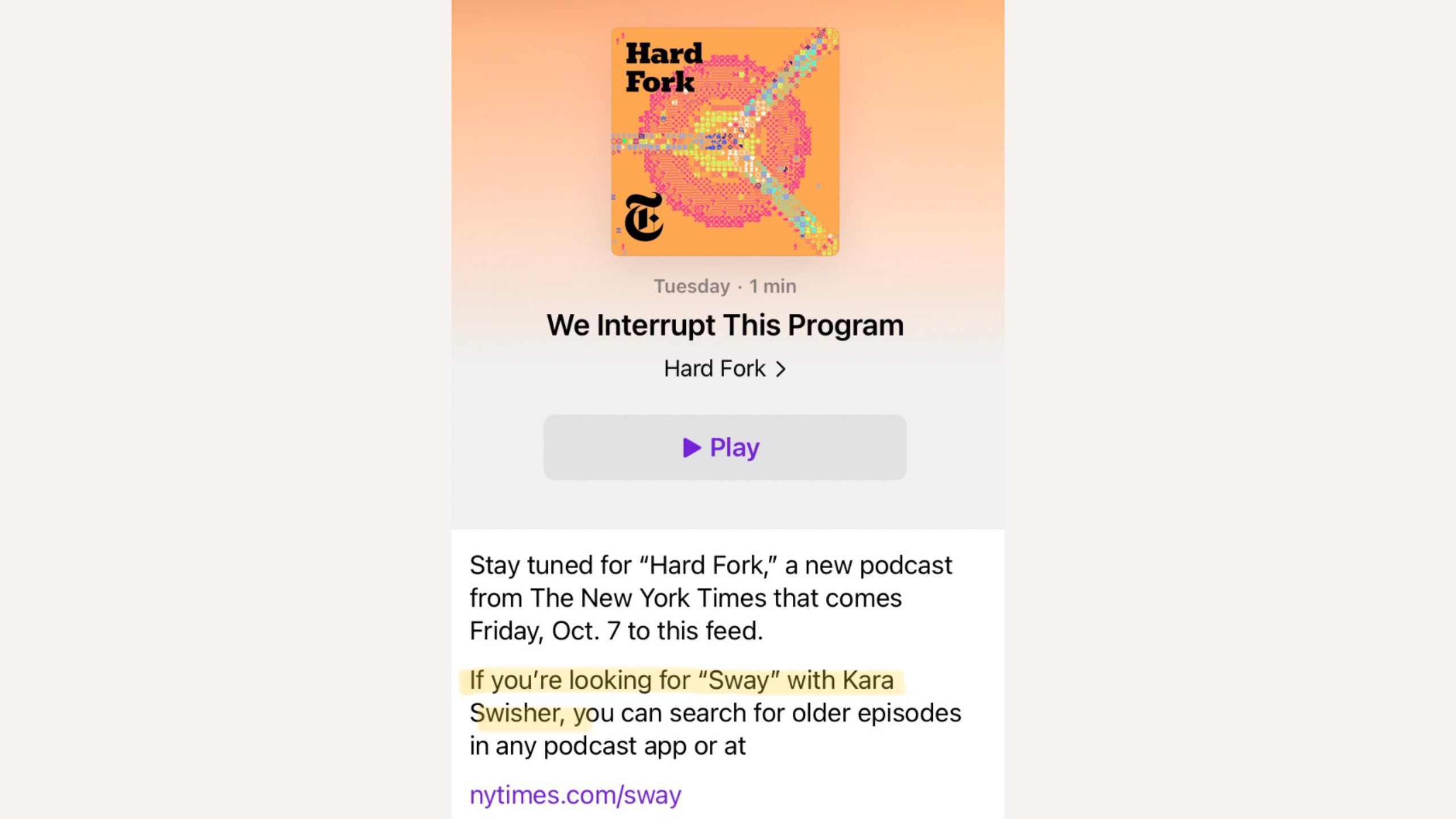 It appears the company repurposed Swisher’s old podcast feed and rebranded the page to get traction for the new show. Fans who once subscribed to Sway, were now grandfathered into Hard Fork subscriptions.