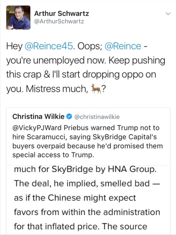 .@ArthurSchwartz did @Scaramucci sanction your spreading accusations against @Reince‘s personal life?