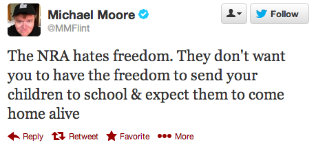 In response to the horrific Friday morning shooting massacre in Newtown, Conn., that left 20 schoolchildren and 7 adults dead, documentary filmmaker Michael Moore took to Twitter to bash the National Rifle Association and call for Americans to demand stricter anti-gun legislation and free mental health care.