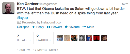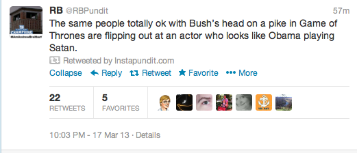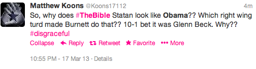 Even prior to the episode’s showing, Glenn Beck tweeted: “Anyone else think the Devil in #TheBible Sunday on History Channel looks exactly like That Guy?”, adding a photo: