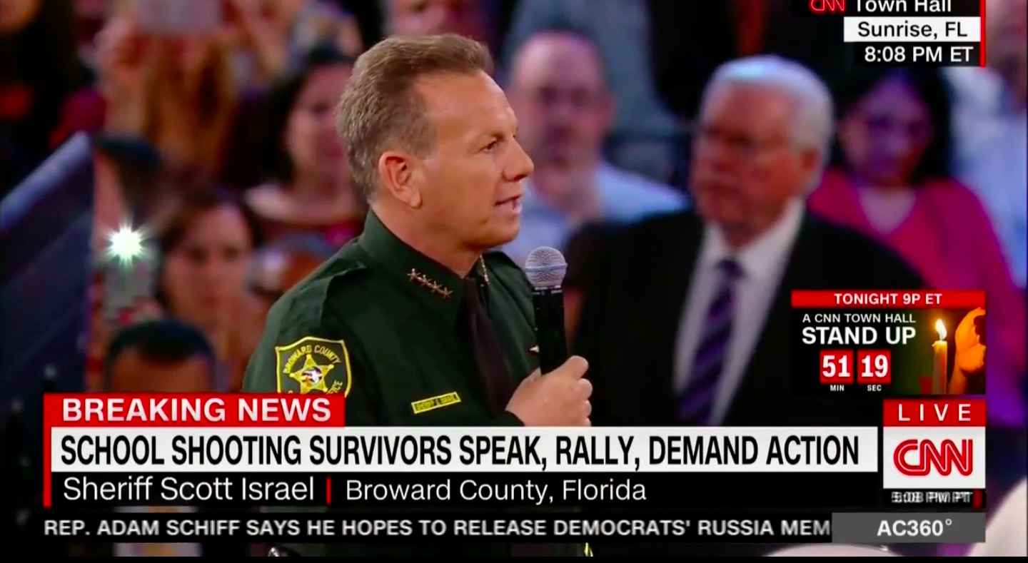After he chastised NRA spokeswoman Dana Loesch at the CNN Town Hall over gun control, numerous developments regarding his office have surfaced. First, Israel shared to the public that an armed on-campus deputy, Officer Scot Peterson, waited outside Marjory Stoneman Douglas High School for four minutes before going in (the entire shooting reportedly took place within six minutes). Then it was reported that his office was warned about the shooter back in November but was never documented in their files. And earlier this evening, it was reported that the sheriff’s office had three additional armed deputies outside the high school but hid behind their vehicles.