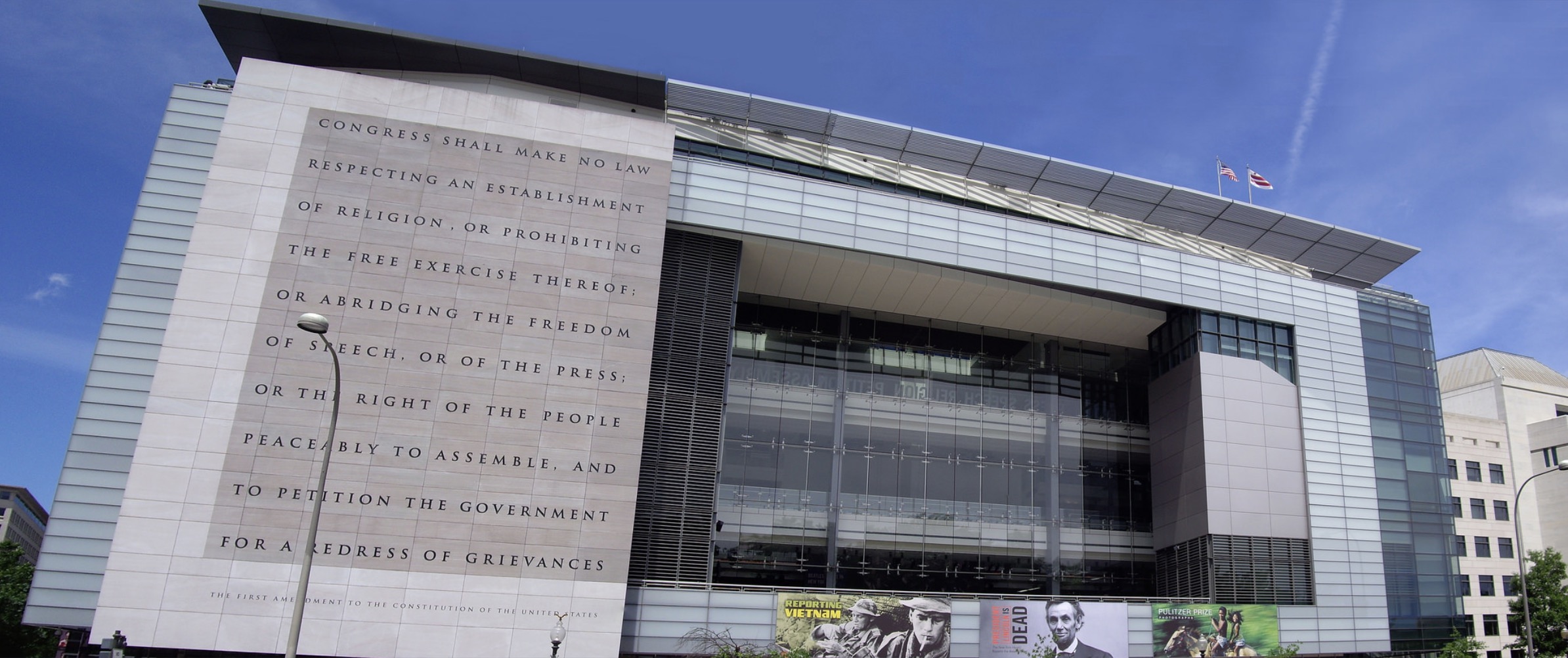 Outside the Newseum is a banner calling for the release of Austin Tice, an American journalist held captive in Syria for going on 6 years. The US government believes he is still alive.