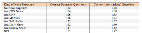 The largest effect is that of Fox News: all else being equal, someone who watched only Fox News would be expected to answer just 1.04 domestic questions correctly — a figure which is significantly worse than if they had reported watching no media at all. On the other hand, if they listened only to NPR, they would be expected to answer 1.51 questions correctly; viewers of Sunday morning talk shows fare similarly well. And people watching only The Daily Show with Jon Stewart could answer about 1.42 questions correctly.
