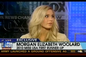 Since the public apparently loves events where scantily-clad women walk around in silence for two hours and then get 30 seconds to talk about how much they love world peace, the Miss USA Pageant is still being talked about two days later. The pageant’s runner-up, Miss Oklahoma Morgan Elizabeth Woolard, visited Fox and Friends this morning to talk about how unfair it was that she had to articulate an opinion on an actual issue, and not, like winner Rima Fakih, “Facebook and MySpace.”