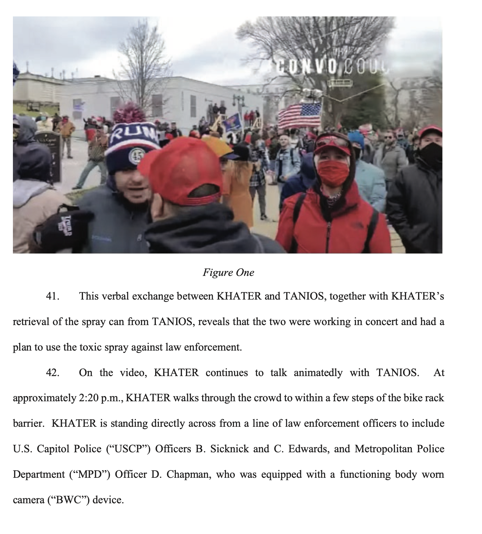 Court documents — obtained by Mediaite sister site Law&Crime — quote Khater as saying to Tanios, “Give me that bear shit,” in a video taken during the attack. Khater was allegedly caught on video spraying a canister into the faces of Sicknick and two other officers.