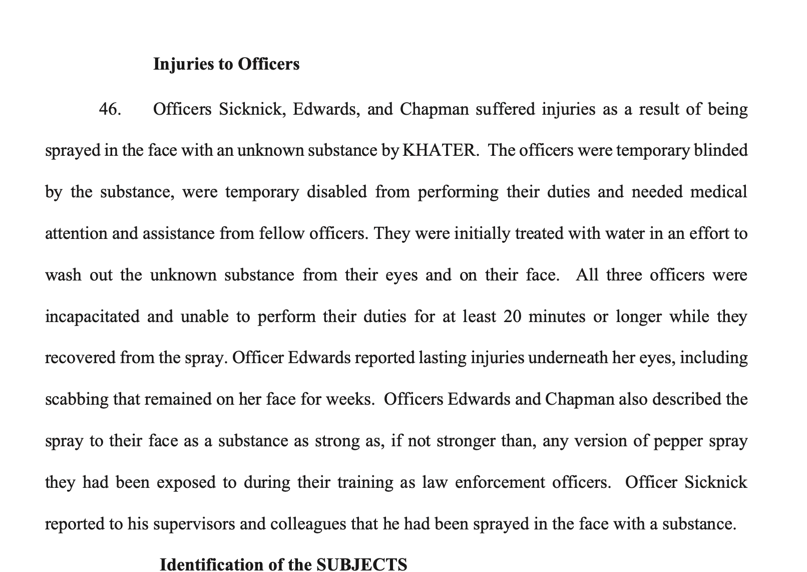 The documents outline the extent of the injuries sustained after the officers were attacked with the bear spray: