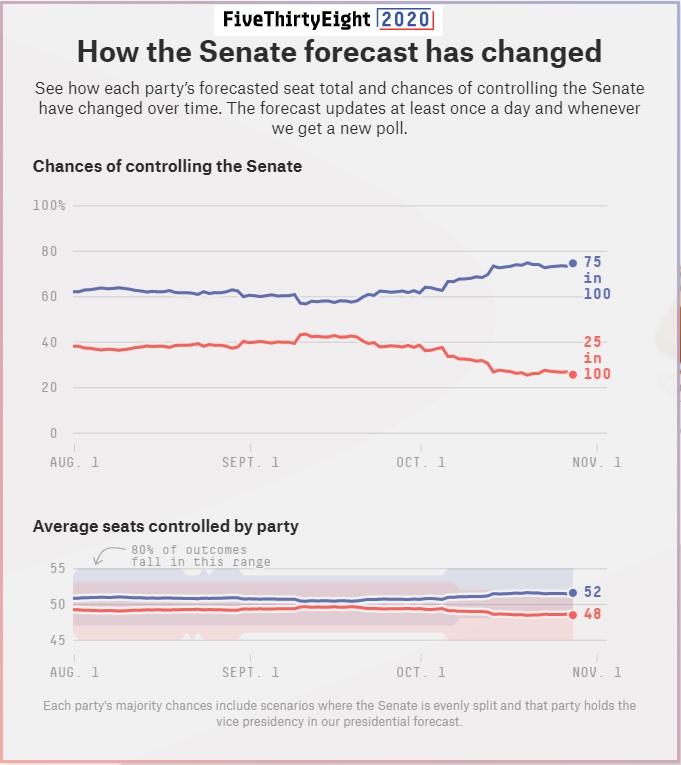 RCP’s forecast now shows Democrats with a shot at 54 seats, while FiveThirtyEight has them with a chance at landing on a 55-45 majority — unchanged since our last update. Democrats’ chances of winning control of the Senate have ticked up a few points to 75 percent.