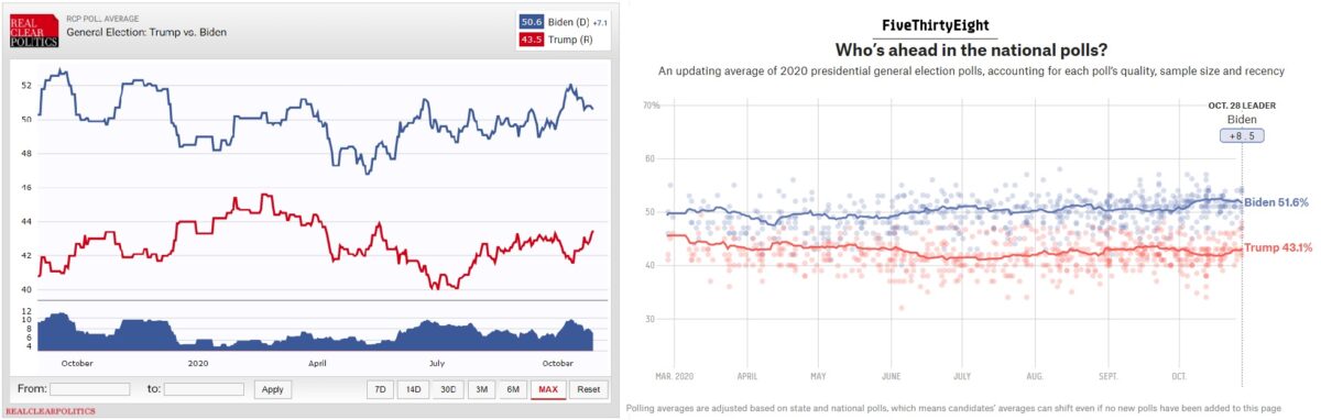 As of this writing, the RCP average has Biden up 7.1 points over Trump, a narrowing of 3/10 of a point and a continuation of a glacial trend. The FiveThirtyEight average shows a more significant narrowing, with Biden at 51.6 percent to Trump’s 43.1 percent — putting Trump more than half a point closer to Biden in that average.