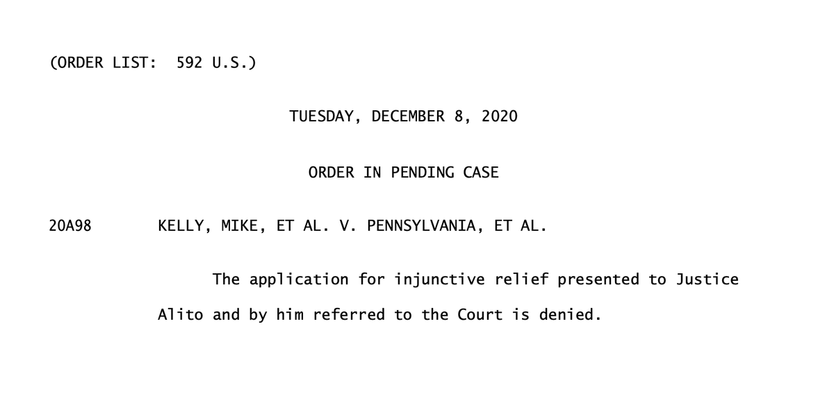 This is the Supreme Court order denying the request by Rep. @MikeKellyPA and others to invalidate Pennsylvania’s presidential election. That’s the whole thing. It was denied by the full court with no public dissents. pic.twitter.com/aTqC9oNuj3
