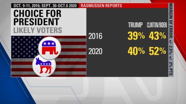 Even Rasmussen research, which many regard as right-leaning, showed Clinton ahead by 4 in 2016. Now they have Biden up nationally by 12 percentage points.
