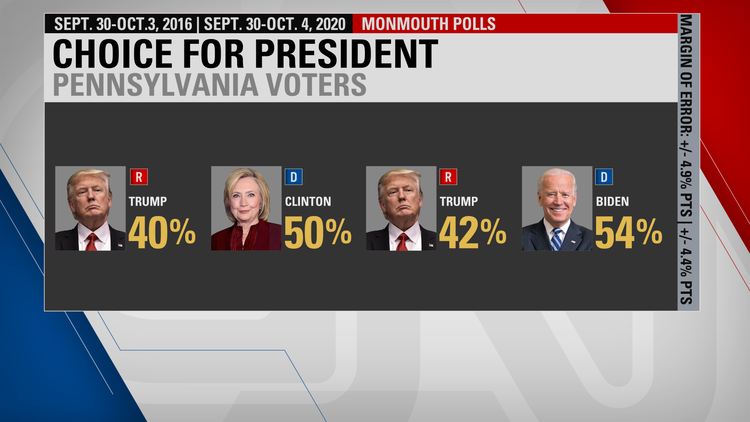 Hillary Clinton lost Pennsylvania by less than one percentage point, but New York Times/Siena poll had Clinton up by 7 in late October of 2016. That same poll in early October of 2020 also has Biden up by 7. Also in Pennsylvania, a Quinnipiac poll had Clinton up by five percentage points in late October of 2016. Today, that same poll shows Biden up by a much wider margin of 13 percentage points. Monmouth at this time in 2016 gave Clinton at 10 point lead in the Commonwealth. Monmouth currently has Biden up 12 in Pennsylvania.