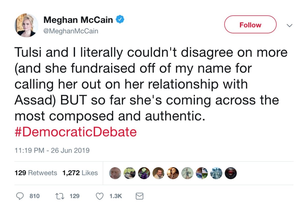 Meghan McCain Deletes then Re-Posts Praise of Tulsi Gabbard Debate Performance