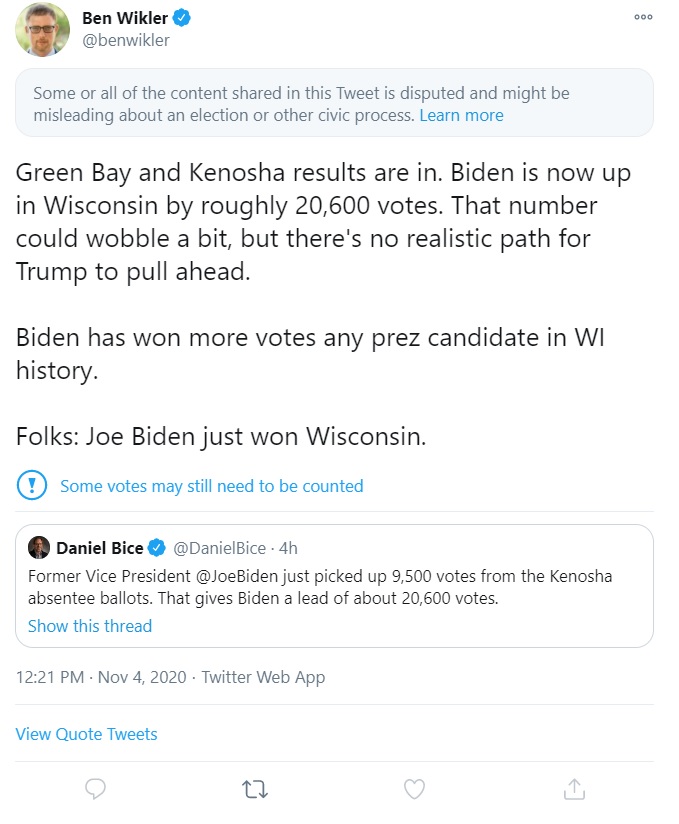 “Green Bay and Kenosha results are in. Biden is now up in Wisconsin by roughly 20,600 votes. That number could wobble a bit, but there’s no realistic path for Trump to pull ahead. Biden has won more votes any prez candidate in WI history,” Wikler tweeted. “Folks: Joe Biden just won Wisconsin.”