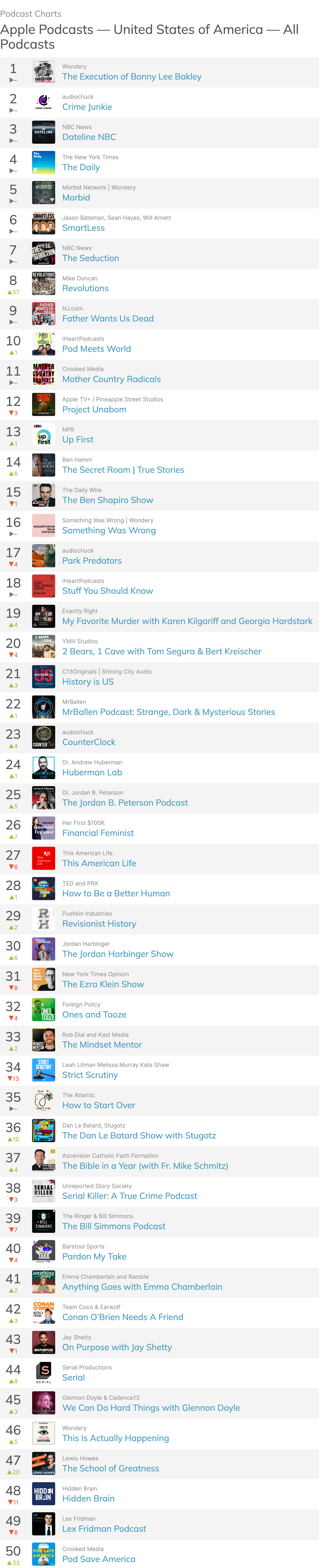 Taking the top spot for the third week in a row is the The Execution of Bonny Lee Bakley. The podcast covers the story of the fatal shooting of Bonny Lee Bakley, the wife of actor Robert Blake and dives into her mysterious background of fame, fortune, and a history of con artist schemes.