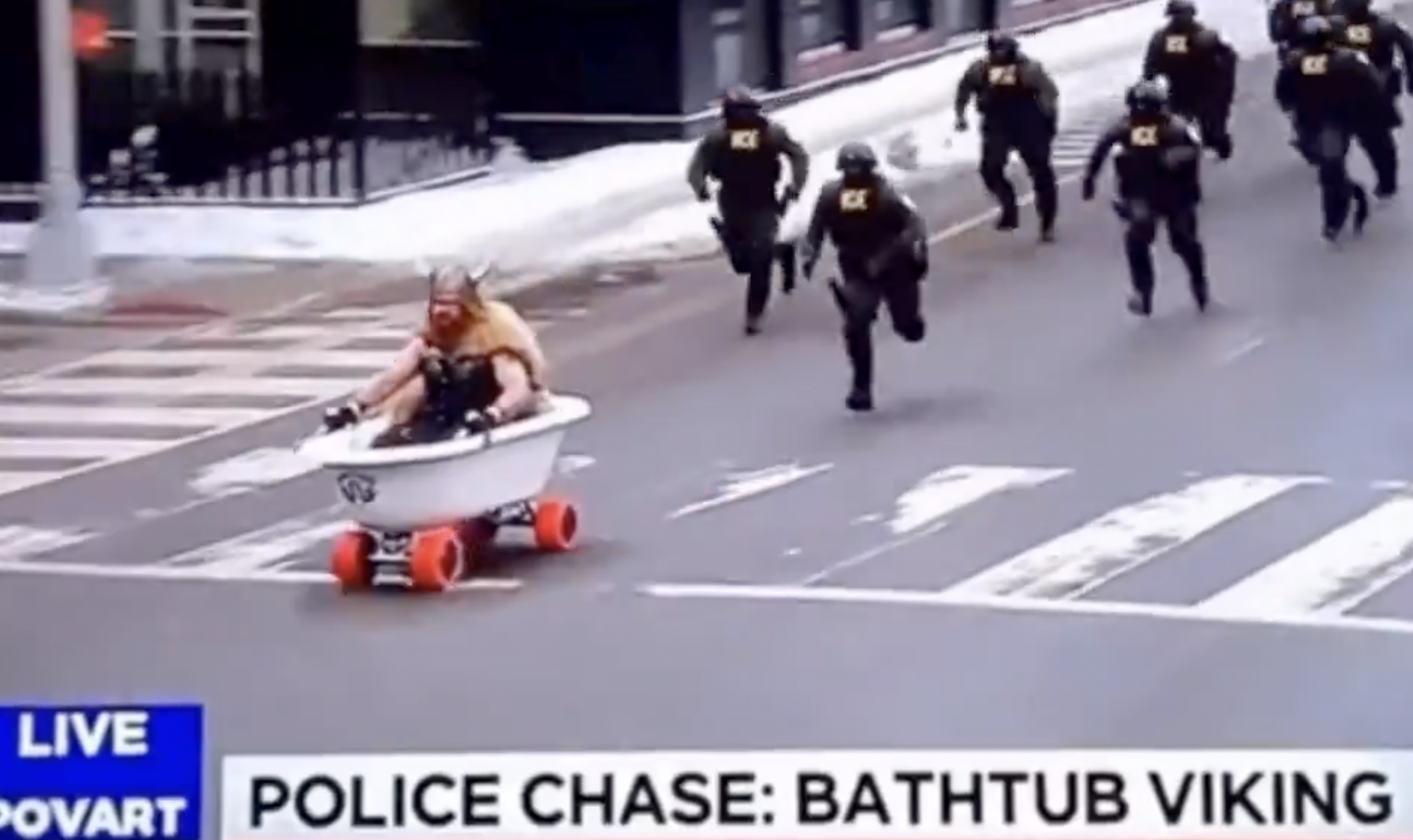 “We are live over downtown Minneapolis where, yes, that is a protester in a Viking costume riding what appears to be a porcelain bathtub on skate wheels — 15 ice agents are on his heels,” the AI newscaster yelped. “But look at this, he’s pulling away. Watch the slush! Watch the slush!”