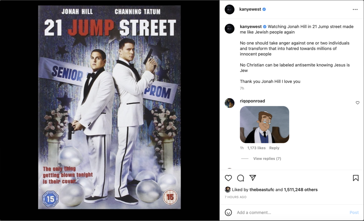 In a new Instagram post, West claimed he likes Jewish people again and it’s thanks to filmmaker Jonah Hill and the movie 21 Jump Street.