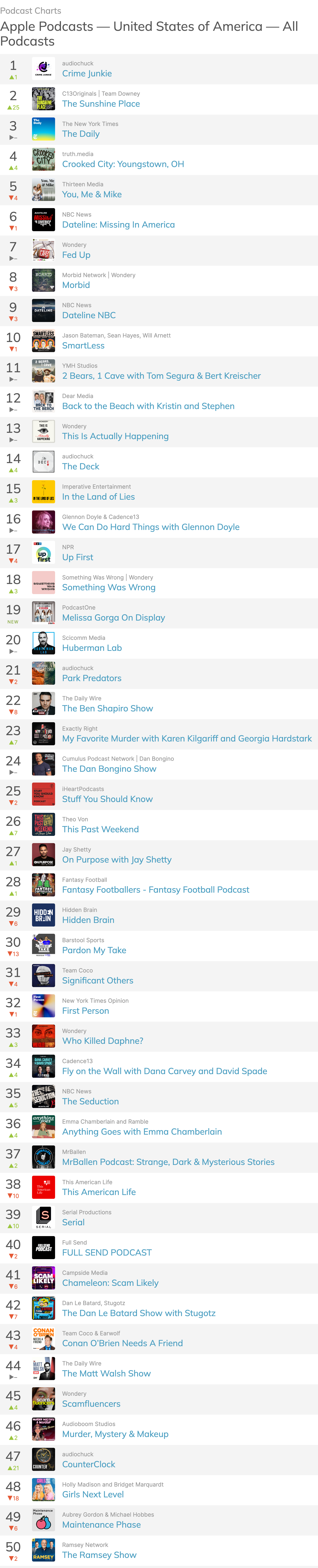 Following Crime Junkie is The Sunshine Place, The Daily, Crooked City: Youngstown, OH, and You, Me & Mike.