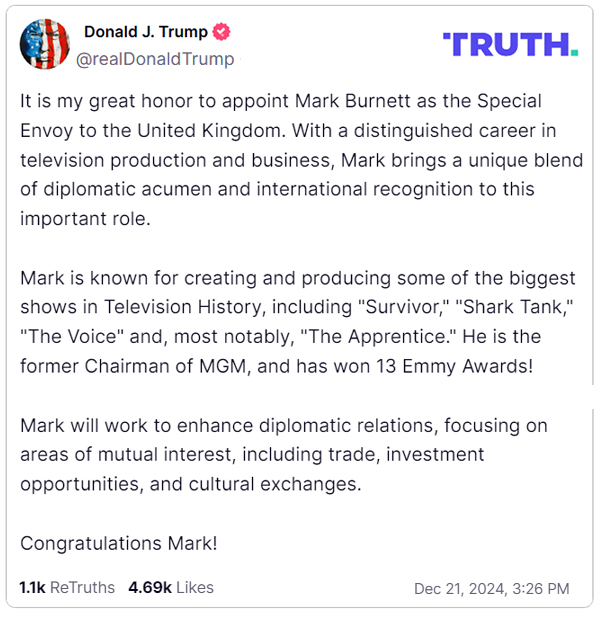 “It is my great honor to appoint Mark Burnett as the Special Envoy to the United Kingdom. With a distinguished career in television production and business, Mark brings a unique blend of diplomatic acumen and international recognition to this important role,” Trump wrote on Saturday.
