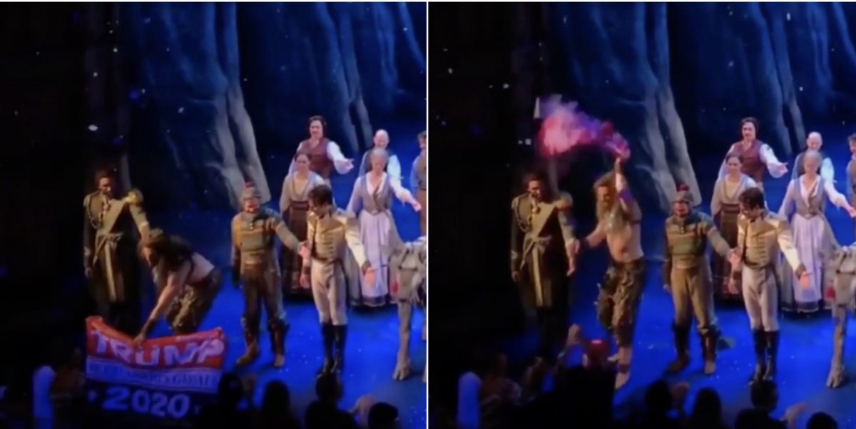 WATCH: Frozen Actor Rips Trump 2020 Banner from Audience Member During Broadway Show