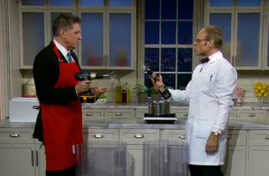 With The Next Iron Chef: Redemption’s premiere date looming, host Alton Brown took to the Late Late Show With Craig Ferguson to best represent the Food Network’s brand: with random screaming, manic laughter, and strange food creations. Is that really cotton candy, Alton? Because you’re making it with a weird drill that looks like a robot sex toy, and then serving it on the head of a female Barbie doll.