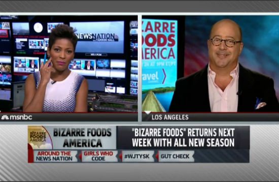 We listen to Andrew Zimmern give his “promoting peace, love, and understanding through the lens of food” speech during every press blitzkrieg for every new season of Bizarre Foods America, but this quick plug on Tameron Hall’s new MSNBC show News Nation is especially cute, because the pair both confess that they have secret, tiny crushes on each other. Check out the lovefest below, which only blossoms after Andrew tells Tameron that he used to be a homeless junkie whom people used to cross the street to avoid. True girlcrush!