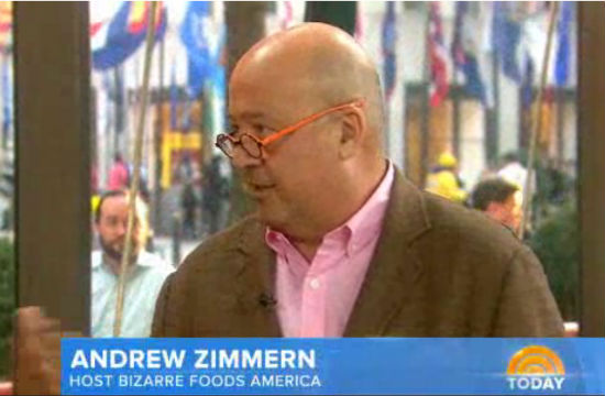Andrew Zimmern stopped by The Today Show this morning — sidenote: wearing the world’s most adorable-looking grandpa cardigan styled to look like a blazer — to force-feed Savannah Guthrie chicken hearts preach the good word of Bizarre Foods, and how it’s ultimately a show about cultural tolerance. Said Andrew: