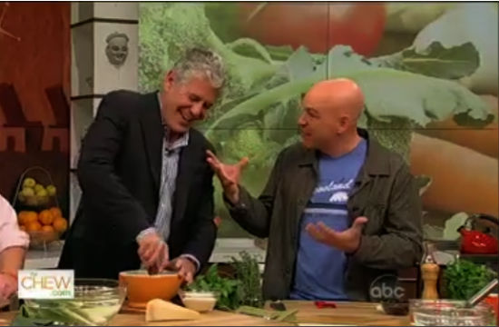 After an early morning start on GMA, Anthony Bourdain headed straight to The Chew to shoot another press tour spot on the food-centric talk show hosted by old pals Mario Batali and Michael Symon. He managed to half-heartedly cook his way through a brutal pasta demo before eventually backing away and letting Batali and Symon take over. Turns out he had some scarring Martha Stewart cooking segment experience once where she smacked him because he couldn’t figure out how to operate pasta machine. Sounds like dark shit. We’d abandon the mortar and pestle and rest solely on our charms, too.