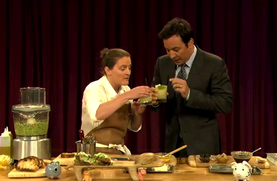Bloomfield was on the show to promote her upcoming gig on Mind of a Chef on PBS, as well as her not-so-new cookbook, A Girl and Her Pig, which Fallon reminds us is “not a children’s book.” See all the singing and mush-slinging for yourself in the clip below.