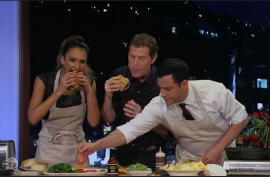 Jessica Alba isn’t totally useless in a kitchen! She follows directions well and has good instincts. Unfortunately, Bobby Flay could only remain in control of his Jimmy Kimmel Live perfect burger demo if he never looked directly at her. We get it. Her beauty blinds like the sun. Check out those guns. We bet her hair smells insanely delicious. You have our sympathies, B-Flay.
