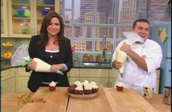 Rachael Ray was very forward about her lack of baking prowess on her talk show today, which is why she brought in Cake Boss Buddy Valastro to help her demystify the red velvet cupcake. But Buddy didn’t go easy on Rachael by any means. He scolds her all the way from batter to frosting for rushing, failing to measure, and keeping a messy work station. And just when you think he bestows a compliment upon her piping skills, he initiates a frosting race, which Rach, of course, miserably loses.