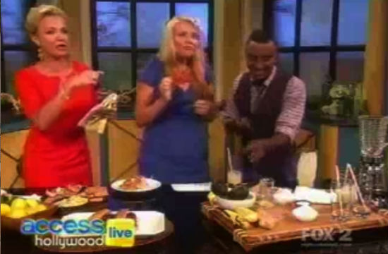 Michelle Beadle and Busy Phillips took over co-hosting duties on Access Hollywood today to cover for an ailing Billy Bush, much to Marcus Samuelsson’s chagrin. He stopped by to demo his blackened catfish and a banana-avocado smoothie while talking about his new memoir Yes, Chef, but he could barely get a word in amongst the magpies chattering about their cooking habits.