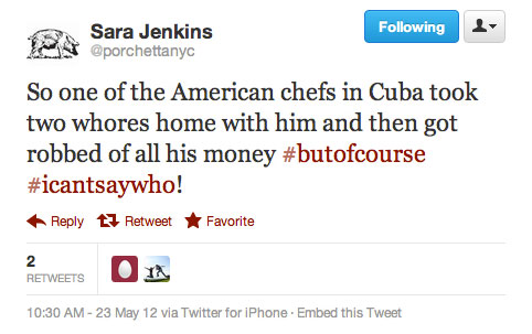 Maybe this mystery chef should have gone to Vegas, because apparently what happens in Havana makes its way onto Twitter. This morning, Sara Jenkins, the chef/owner of Porchetta and the director of the Proyecto Paladar, a 10-day Cuban-based cooking trip pairing 10 American chefs with 10 local chefs, tweeted that one of the visiting chefs found themselves in a little bit of trouble.