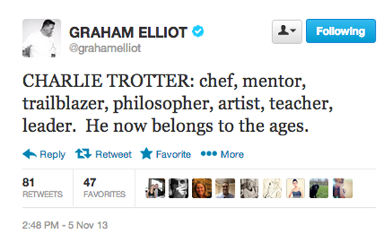 News of Charlie Trotter’s death broke just over an hour ago, and with so many of his shuttered two-Michelin-starred restaurant alums now famous chefs in their own right, fond remembrances are already pouring in via Twitter. Mario Batali and Andrew Zimmern even extended condolences to his wife, Rochelle, reminding us of the family he leaves behind, including his son, Dylan, who first found Trotter unconscious in their home.