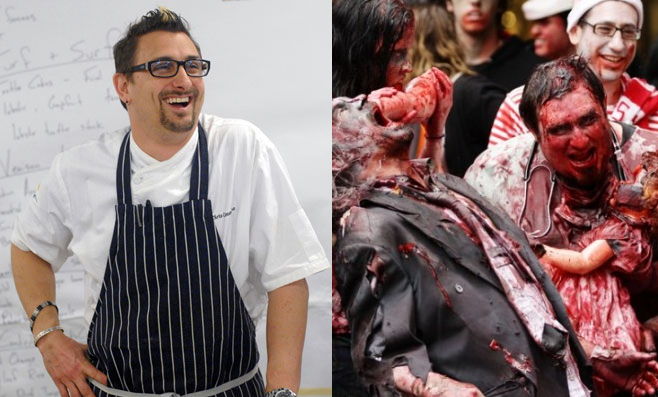 People will watch zombies eat people on television but can’t watch an animal be harvested to be served as food. They’ll watch a gang movie where people are murdering each other but they can’t watch someone slaughter a turkey for Thanksgiving. Is that fucked up? Am I wrong? Where’s the disconnect here? Why is this happening? Isn’t Walking Dead the number one show right now? People keep telling me about it. And they say I’m fucked up because I serve organ meat?