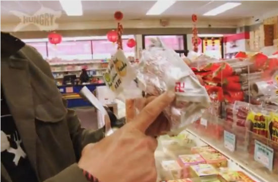 He also makes a tiny error which resulted in a YouTube Comment Troll Uprising, but we’ll take it upon ourselves to point it out for you, so you don’t have to complain about it. He chuckles at what appears to be a swastika stamped on one of the packages of meat in the deli case and has a major “WTF, this is not your mama’s market” moment. Calm down, Chris. It’s a Buddhist swastika, which, when stamped on food products, simply means that they’re vegetarian, and the making of the product has caused no harm to animals. We’re on it guys. No big deal.