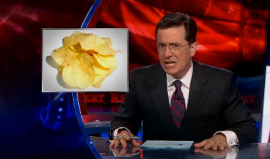 Over the weekend, a Mexican drug cartel burned down a Pepsico chip warehouse, and Colbert would like them to know who they’re messing with. To hear Colbert tell it, America’s Snack Cartel has its “nacho-stained fingers in markets all over the world” — they’re even in bed with Ferran Adria — and includes such unsavory characters as “El Fuñons” and “Don Pringles”, the latter of whom will “pop a cap in your ass, and once he pops, he cannot stop.”