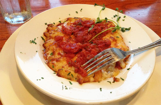 “Ooh!” she said softly, pointing at this menu item: “Baked macaroni with Gruyère, fontina, mozzarella, and parmesan cheese, gratinéed with Mornay sauce, topped with marinated slow-roasted Roma tomatoes.”