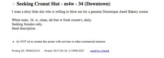 We’ve moved past the cronut black market, shilling them around the city at insane markups, and have moved onto shilling them in exchange for high demand sexual favors. A man posted the following ad on Craigslist, w4c: