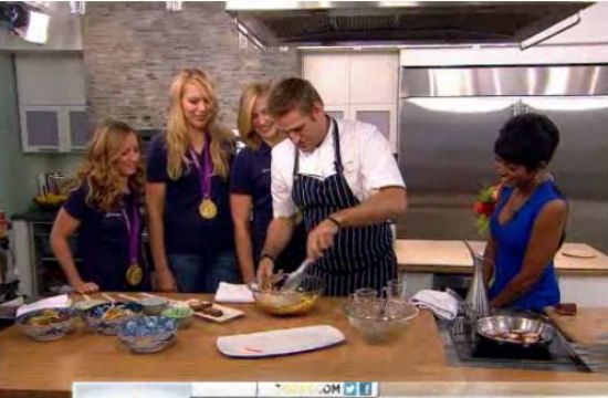 NBC is weaning us off the Olympic teat by featuring various US Olympic stars on The Today Show all this week to offer them a hero’s welcome back Stateside. This morning, Curtis Stone was on hand to roast (not braise; never braise) up some crispy pork belly with rice noodles and veggies with three of the gold medal-winning lady rowers from the Women’s Eight. Unfortunately, one of them was a vegetarian, but Curtis was nice enough to make her a veg version of the dish and remain cool through the slightly awkward demo.
