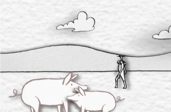 Apparently, this cookbook is an homage to happy farmers, happy chickens, happy skybirds, happy porks, happy bunnies, clouds, happy cows, cheery cab drivers, ferryboats, and disproportionately giant vegetables. We want to go to there. You can too. Check out the vid below.