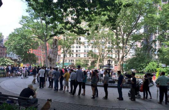 To celebrate the ten year anniversary of opening their first shack in Madison Square Park, Shake Shack is offering five limited edition burgers created by celebrity guest chefs in their flagship location. Last week, Daniel Boulud debuted his Piggy Shack (which sounds like an Angry Birds first draft, but we digress), which sold out yesterday. Today, David Chang’s Shrimp Stack takes over, and it’s already broken the official record for Longest Madison Square Park Shake Shack Line Of All Time. It wrapped all the way to the fountain you guys. The Fountain. Check out the photos below.