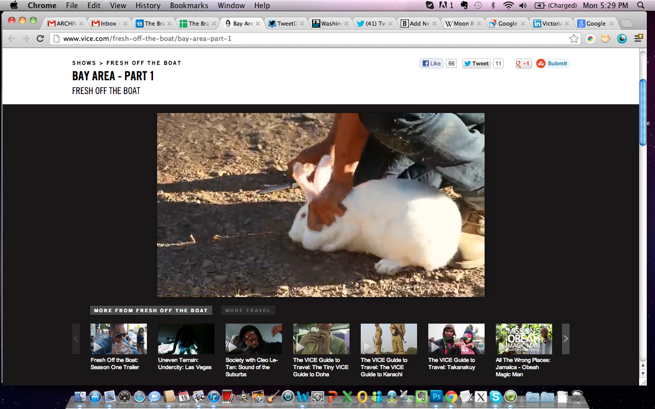 It was funnier when Huang and the crew of his VICE show were chanting “Kill Whitey!” (“Whitey” being the name of the rabbit that they select for slaughter at an Oakland shooting range with the East Bay Rats, of course. Huang’s not race-baiting on this show.) Heck, he loved making fun of “mouthbreathing” hipsters shooting guns. But when Huang is confronted with the sight of the rabbit, squirming helplessly under the knee of its butcher, bleeding out the neck, he’s repulsed — surprising himself.