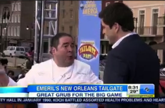 We had no idea what Emeril Lagasse was making on today’s chaotic Good Morning America cooking segment, because it was on location in New Orleans, and OH MY GOD SCREAMING and WHOA SUPERBOWL. There were football players involved, so Josh Elliott turned into a former sportscasting puddle of fanboy. Emeril quickly lost control of the demo. All we got was roux, cream, and a fuckton of cheese. Gumbo, we think? Who knows.