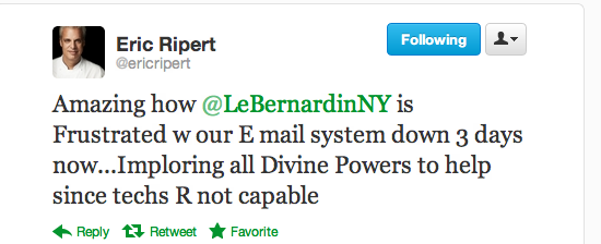 Le Bernardin has been having problems with its email reservation system and internet all day (their 4-star NYT review may have a little something to do with it), and Eric Ripert has taken to the Internets looking for help.