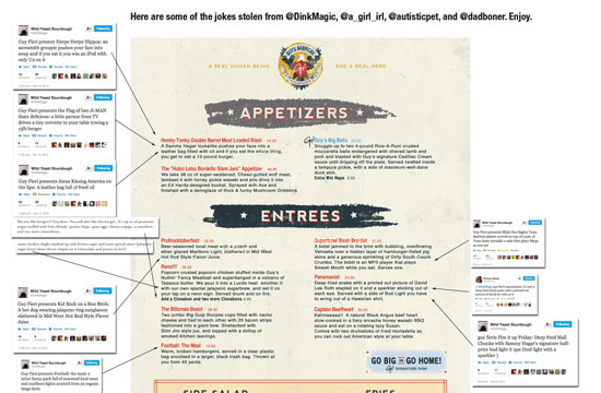 A few Twitterers, as well as a group of goons from Something Awful (which still exists, apparently) noticed a few similarities between the fake Guy’s American Kitchen and Bar tweeted out by programmer Bryan Mytko, and jokes from a variety of different sources: the Simpsons, Gothamist, and various funny Twitter users (with the most unforgivable gank from our beloved @Dadboner).