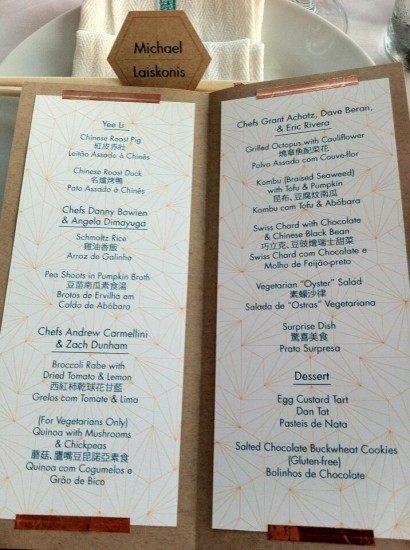 Heart-burstingly sincere food writer Francis Lam married his ladylove Christine Gaspar over the weekend in a New York City rooftop ceremony, followed by a reception catered by (deep breaths, if you’re the jealous bride type) Yee Li, Danny Bowien and Angela Dimayuga, Andrew Carmellini and Zach Dunham, and Grant Achatz, Dave Beran, and Eric Rivera. The menu (which listed the dishes tri-lingually) reflected both Lam’s Chinese heritage and the bride’s Portugese background.
