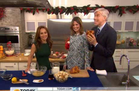 As Giada de Laurentiis was about to begin demoing holiday breakfast ideas — the plural of which is “breakfastses”, according to David — he introduced her as “Today Show Contributor-In-Chief,” while absentmindedly fondling her french toast challah. He did chivalrously help out with the task of cubing the challah for the demo, but he quickly gave up and just started eating it. David Gregory really likes challah, you guys.