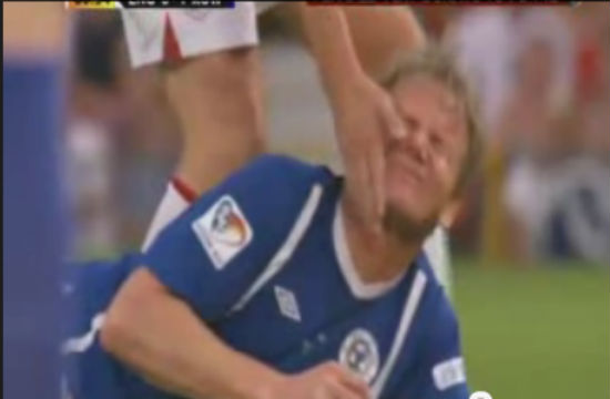 We reported over the weekend that Gordon Ramsay spent his holiday getting the crap body-checked out of him by British soccer star Teddy Sheringham during a charity soccer match, and, thankfully, the video footage has surfaced. The injury occurred after the first five minutes of game play, prompting the announcers to speculate that Gordon was being “targeted.” We’re sure he pissed off Teddy’s cousin who’s a line cook in one of his establishments or something at some point.