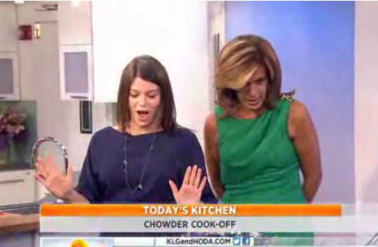 On Today this morning, Hoda called Gail Simmons “Rachael” (as in that other curvy, expressive brunette who also happens to be a food celebrity) a total of FOUR TIMES in one cooking segment. Dear, sweet Gail never called out her anchor, although that was probably because she was being featured on a Clam Chowder “Quickfire” Challenge against Hubert Keller in honor of the upcoming Food and Wine All-Star Weekend in Vegas, and it was impossible to demo a chowder in under a minute AND correct Hoda while the pair kept interrupting/goofing off.