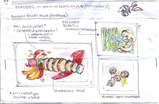 Then came the dish presentation. It needed to be simple but somehow also provide a glamorous visual… How would Hannibal serve this dish to Jack? A silver tray maybe? Touches of chervil here and there? Roasted apples with caramelized crystal sugar around it? Yes… This is a great moment! We need to do this!